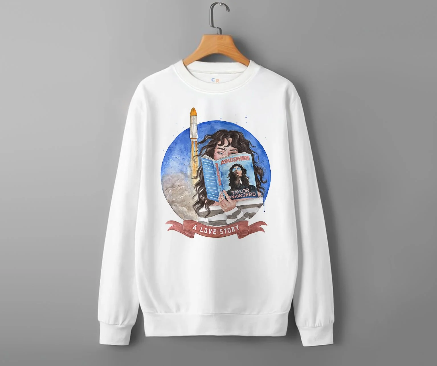 Atmosphere book white sweatshirt | Taylor Jenkins Reid book UK & US cover options | hair color and skin options